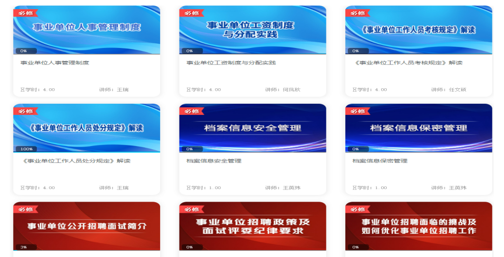 点击蓝字 关注我们 2024年以来,人力资源和社会保障部事业单位人事服务中心(以下简称事业中心)加快开发具有自主知识产权的事业单位培训精品网络课程,丰富线上学习资源,更好满足基层事业事业单位和人事工作者培训需求,缓解工学矛盾。 着力开发精品课程 服务事业单位人事政策宣贯,开发人事管理核心课程,包括:事业单位人事政策综合解读,以及公开招聘、岗位管理、人员考核、处分申诉、工资福利、职称管理等内容。 服务岗前和在岗培训规范化,开发公共科目重点课程,包括:大力推进中国式现代化、国家安全教育、事业单位公文写作、调查研究、沟通协调、应急处突等内容。 服务公共就业服务能力提升,开发就业服务专业课程,包括:基层就业服务、职业指导、专项竞赛参赛指导等3大类13门课程。 服务基层初见成效 2024年,依托中心建设的全国事业单位工作人员培训服务系统和“中国教育培训”微信号移动学习功能,提供智慧化、便捷化、个性化的在线学习服务,构建智慧学习新赛道。 2024年,中心重点开展了事业单位工作人员线上岗前、在岗培训、人事管理示范培训,以及公共就业服务能力提升等7期线上班,线上线下一体推进,直播教学与网课学习一体融合。 2024年,中心为内蒙古自治区提供的事业单位人事工作线上培训班,覆盖全区,千人同学;为河南省提供的省直事业单位线上岗前示范培训班,连续四年订单式服务深受好评。 构建线上智慧学习 2025年,中心将顺应干部培训数字化发展新趋势,依托中心自有平台和核心课程,健全线上培训工作标准,持续开发精品核心课程,加快资源整合和共建共享,进一步构建线上智慧学习新赛道,服务打造中心事业发展整体“一招鲜”。 来源 :人社部事业中心培训规划服务处 联系方式: 010-84632937 培训工作简介 人力资源和社会保障部事业单位人事服务中心是全国第一家服务广大事业单位的权威专业机构。中心立足培训职能,坚持外向发展,发挥自身课程、师资、资源和平台优势,积极承接行业部门和企事业单位的委托办班、机关讲堂、培训课题研究等,参与全国事业单位培训政策调研、大纲编制、课程开发、教材建设、网络平台建设等工作。此外,长期开展专业技术人员继续教育和国际交流、职业技能提升网络培训,承担国家“专业技术人才知识更新工程”任务,承办人社部机关党校教学服务保障。 往期精选