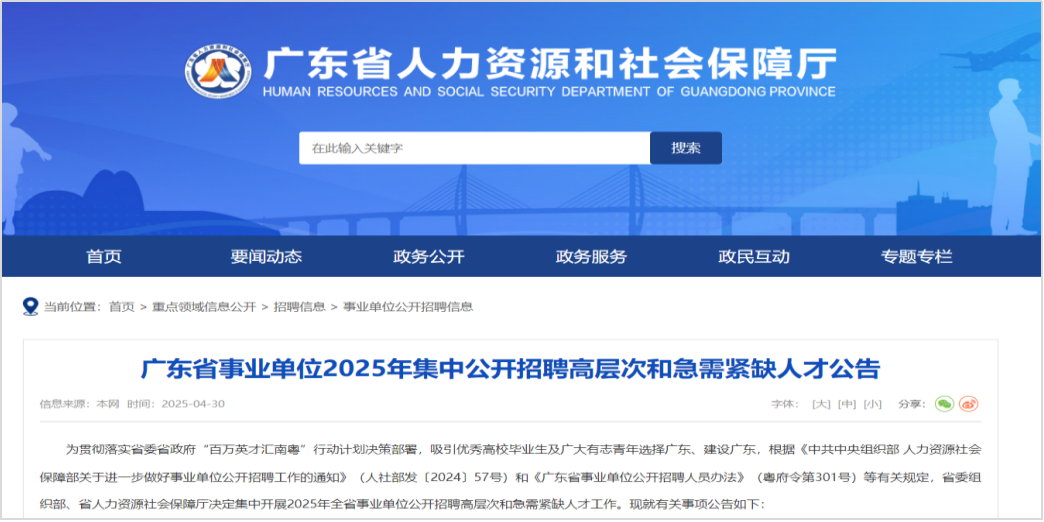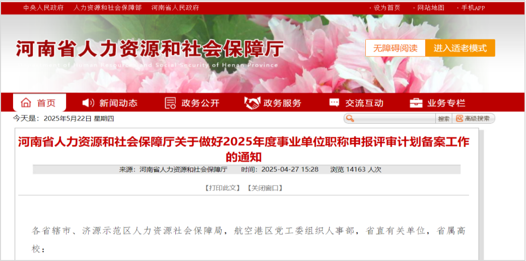 点击上方蓝字,关注我们 事业单位人事管理 引言:为方便相关单位及时了解事业单位人事管理最新政策法规、工作动态和其他参考信息,人力资源和社会保障部事业单位人事服务中心(简称人社部事业中心)定期编制相关“政策信息摘编”。本期摘编包括工作要闻、工作动态、地方实践、基层探索、答疑解惑等内容。 会议强调,要深刻领会习近平总书记对人才工作最新重要论述精神和中央对进一步深化人才发展体制机制改革新部署,坚持党管人才原则,坚持教育科技人才一体推进,支持保障人才高地和科技创新中心建设,服务发展新质生产力,系统谋划“十五五”专业技术人才工作。要以建设国家战略人才力量为重点,推动博士后事业实现新发展,优化实施政府特殊津贴制度,吸引支持留学人才回国创新创业,全面加强知识更新和继续教育。 来源:人力资源和社会保障部网站 第四批典型案例聚焦社会保险、竞业限制等问题,重点明确用人单位不能通过变相调整工作岗位降低孕期女职工工资及福利待遇、用人单位未依法缴纳养老保险费的应当补足抚恤金差额、主体不适格的竞业限制协议不具有约束力等法律适用标准,对提升劳动人事争议案件处理质效、提高劳动者就业权益保障水平具有重要意义。 来源:中国劳动人事争议调解仲裁微信公众号 1.人力资源社会保障部办公厅关于开展第十四批专业技术人员继续教育基地申报工作的通知(2025年4月) 此次申报范围为承担所在地区或行业专业技术人才知识更新工程重要任务、相关重点领域急需紧缺人才培养培训能力业绩突出的高等院校、科研院所,地方、部门或行业教育培训机构,专业协会(学会)及大型企业培训机构。优先从区域性、行业性专业技术人员继续教育基地中推荐遴选,向数字技术领域、绿色低碳领域倾斜,鼓励支持民营企业申报。 来源:人力资源和社会保障部网站 2.国家机关事务管理局办公室关于做好2025年度中央国家机关会计专业技术人员继续教育工作的通知(2025年4月) 《通知》要求中央国家机关凡具有会计专业技术资格,或者不具有会计专业技术资格但从事会计工作的会计人员,均须从取得会计专业技术资格或者从事会计工作的次年参加继续教育。会计人员继续教育实行学分制管理,每年取得学分不少于90学分。其中,专业科目学分不得少于总学分的三分之二。 来源:国家机关事务管理局网站 该专题培训班由人力资源和社会保障部事业单位人事服务中心主办,旨在深入贯彻党的二十大及二十届二中、三中全会精神,服务中央国家机关事业单位社保经办工作高质量发展。两期班共有来自中央国家机关所属事业单位负责社保业务的人事和财务人员近200人参加培训。内容涵盖养老保险制度改革新政策解读,央保参保登记、关系转移接续、待遇核定与发放、经办数字化转型等各个关键业务环节工作指导。 来源:“中国教育培训”微信号 1.北京市人力资源和社会保障局44条人社措施助力优化营商环境(2025年4月) 近日,北京市人社局发布了《聚焦打造国际一流“北京服务”全面优化人社领域营商环境工作方案》,助力打造国际一流的“北京服务”。《方案》指出,将进一步推动职称评审改革,增设低空技术等新兴领域职称评审专业,向更多用人主体下放职称评审权;京津冀人社将探索开展京津冀联合职称评审,举办京津冀博士后与科研人才招收暨项目洽谈活动、京津冀创业创新大赛。 来源:人力资源和社会保障部网站 2021年以来,内蒙古自治区通过一系列创新政策“组合拳”,畅通苦干实干人才晋升渠道,全区共有3.9万名事业单位工勤技能人才搭上晋升快车,真正实现工勤人员暖心上岗、安心工作、幸福退休。自治区人力资源和社会保障厅将自治区本级工勤技能岗位的备案权限全部下放给主管部门,严格落实单位用人“自主权”。 来源:内蒙古自治区人社厅官网 3.江苏省人力资源和社会保障厅关于做好2025年度职称评审工作的通知(苏人社职〔2025〕4号) 《通知》旨在贯彻落实中央和江苏省委、省政府关于分类推进人才评价机制改革、深化职称制度改革等系列部署要求。《通知》指出,取得重大基础研究和前沿技术突破、解决重大工程技术难题,在经济社会各项事业发展中作出重大贡献的专业技术人才,引进的海外高层次人才和急需紧缺人才,可以直接申报高级职称评审。 来源:江苏省人社厅网站 4.河南省人力资源和社会保障厅举办2025年河南省事业单位人事管理工作业务培训班(2025年4月) 河南省人社厅党组书记、厅长丁同民出席开班式并讲话。讲话指出要把握重点关键,全面提升事业单位人事管理科学化规范化法治化水平。培训班围绕事业单位人事管理政策及风险防范应对措施、人员流动管理政策、专业技术人员管理政策、职称评审政策、事业单位工资福利政策等进行了授课。 来源:河南省人社厅网站 《通知》指出,事业单位在专业技术岗位结构比例和相应空缺岗位内,可自主确定本年度职称申报评审计划;按照政策规定,在专业技术岗位结构比例和相应空缺岗位内,自主确定年度职称申报评审计划及未来2年拟申报评审计划;引进的专业技术人员,可不受年度职称申报评审计划限制,在相应空缺岗位内依据岗位条件及聘用有关政策予以聘任。 来源:河南省人社厅网站 6.2025年山东省事业单位就业援青岗